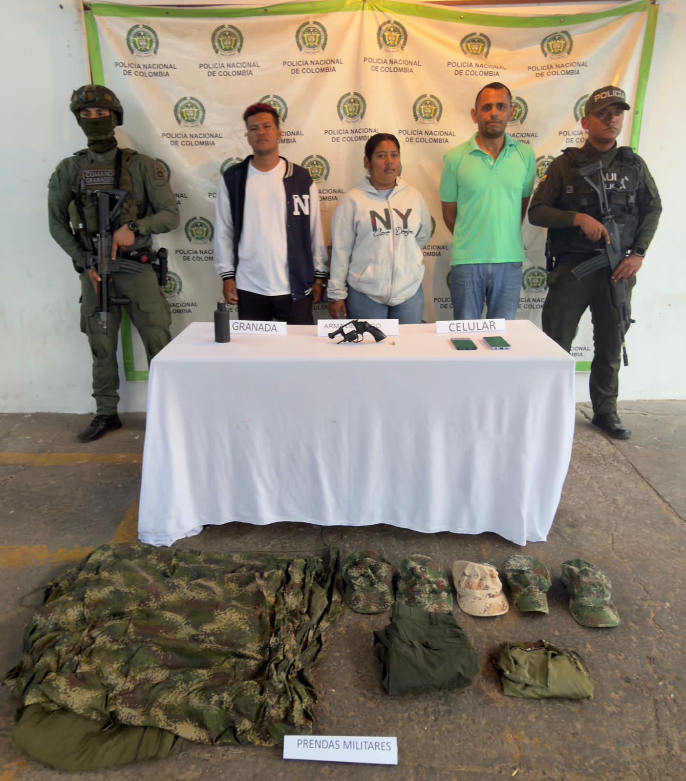 En el desarrollo de estas acciones operativas fueron incautados un revólver calibre 38 marca Taurus de fabricación brasileña, una granada de fragmentación, prendas militares y dos teléfonos celulares, elementos que presuntamente eran utilizados para la comisión de actividades criminales.