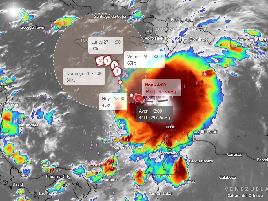 Las condiciones de inestabilidad atmosférica se mantienen elevadas debido a la interacción entre la circulación asociada a la tormenta tropical Melissa, la Zona de Confluencia Intertropical (ZCIT) y una baja presión ubicada en el suroeste del Caribe.
