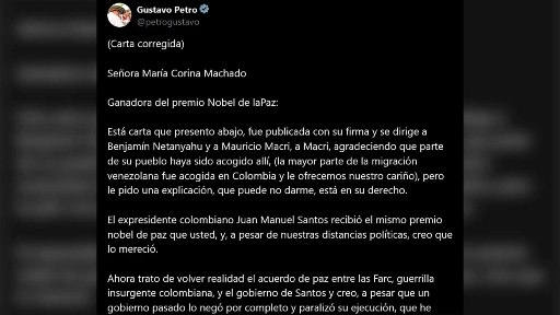 El presidente Petro adjunta —en su mensaje enviado por la red social— una carta que Machado dirigió al primer ministro de Israel, Benjamín Netanyahu, y al expresidente argentino Mauricio Macri “antes que hubiera sucedido el genocidio en Gaza” en la que agradece “que parte de su pueblo haya sido acogido allí, (la mayor parte de la migración venezolana fue acogida en Colombia y le ofrecemos nuestro cariño)”.